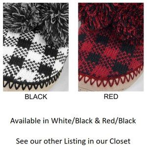 ๐ NEW! Black / White Buffalo Check Plaid Fuzzy Collar Pom Pom Indoor Slipper ๐