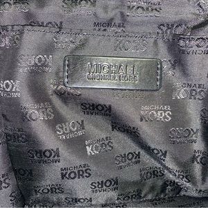 Beautiful authentic Michale Kors dome satchel with signature jacquard black and tan fabric on the outside. The inside in impeccably clean. No holes, or marks that I can see. Black handles and black leather trim piping with gold hardware. Interior has 4 open slip pockets and one zippered pocket. The outside has one open slip pocket in the front.