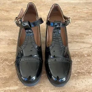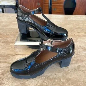 Patent vegan leather Mary Janes have chunky block heels, treaded platforms, and adjustable buckle closures. Purchased in Hong Kong night Market. Never worn