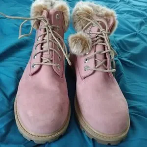 Dusty pink leather with faux fur. Great condition. only issue is few marks on toe area. one boot has the faux fur ball keychain attached.
