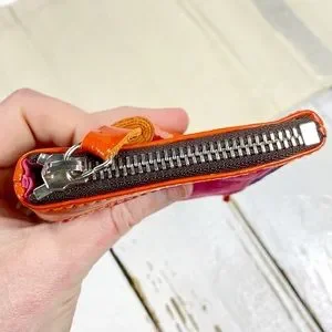 Authentic Lanvin Rare Tasseled Coin Purse crafted from patent leather in orange, orange piping and Nylon front and back in Pink & Purple. It has silver-toned hardware and is in good vintage condition with marks on the top; please observe all photos.