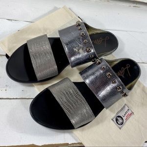 Authentic Lanvin Metallic Studded Slide Sandals crafted from metallic textured calfskin leather with a black sole and adorned with metallic grey studs, these slides are in good pre-owned condition, with the right slide having a more “worn” appearing mark that looks like part of the style; please observe all photos. They are a European size 39 and come with the dust bag.