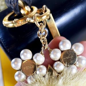 Authentic Fendi Witch Junior Rabbit Fur Bag Charm crafted from real rabbit’s fur with pearls and gold toned hardware. It has dangly legs and “Fendi…made in Italy” engraved on the back of the eyes and the latch ring. It also has a dangling logo charm. This bag charm is in great pre-owned condition. Please observe all photos.