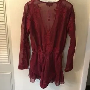 New with tags showpo no filter play suit in wine lace size small deep burgundy embroidered floral V-neck faux wrap , elastic waist flowy BoHo shorts romper long sleeve completely sheer on top lightly lined at the bottom .