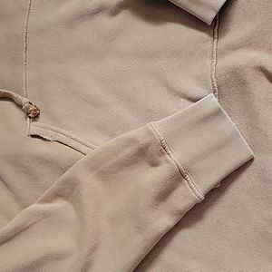 Tan/caramel-colored over-sized hoodie with front pocket.