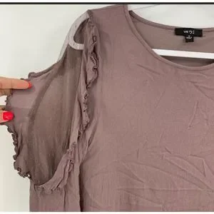 Very J Taupe Violet Long Sleeve Tunic Sheer Women’s Small. Ruffle sleeves with sheer cold shoulder cutout. 100% Rayon