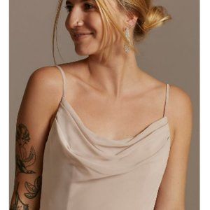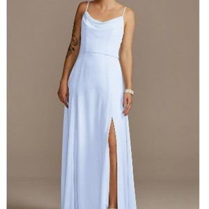 Cowl neck chiffon, floor-length with slit, ice/baby blue color. Back zipper, fully lined. Size 2. Never worn.