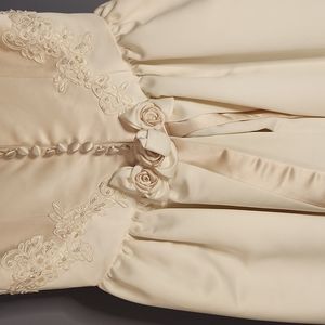 Lace applique with satin flowers, pearls and sequins across bodice.