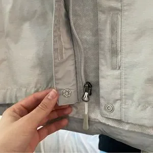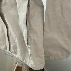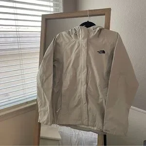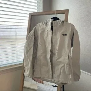 The North Face Dryvent Waterproof and Breathable Jacket in excellent condition!! It is light grey, the pictures show it more of a tan. Tiny mark on back shown in pic that should come right out. Zippers under arms for availability. Zipper, button, and velcro closure in the front. Velcro, adjustable sleeves. Deep pockets. Hood and drawstrings