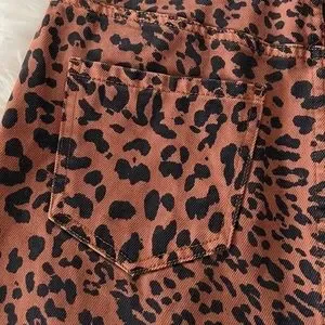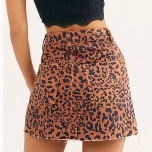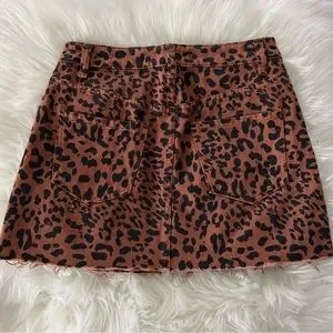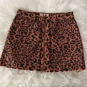 Free People Zip It Up Leopard Print Denim Mini Skirt. Super cute brown & black Leopard print mini skirt, with frayed raw hem, belt loops, 5 pocket style, faded finish, exposed full front zipper fastening. EUC