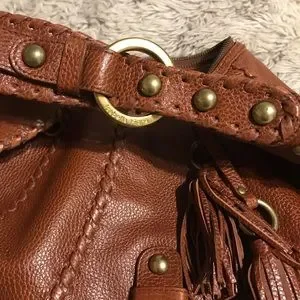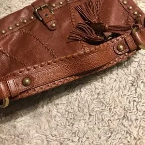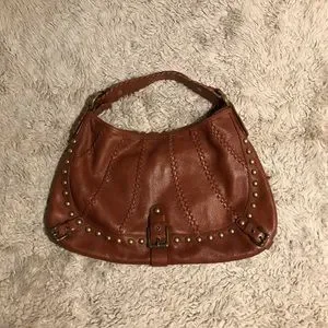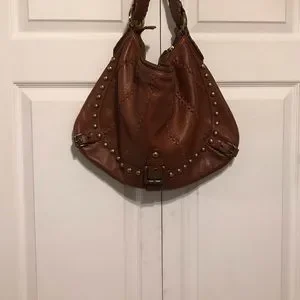 Lovely gently preowned Isabella Fiore leather studded hobo purse in good condition. Interior features one zip compartment and two pockets.