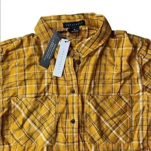 Sanctuary Women’s New Generation Plaid Boyfriend Button Down in Mustard Plaid// Size XS// Brand New w/ Tags!// Cool & comfy button down styled the n quintessential plaid// collar// button front closures// pockets on chest// 100% rayon. Perfect fall color!