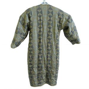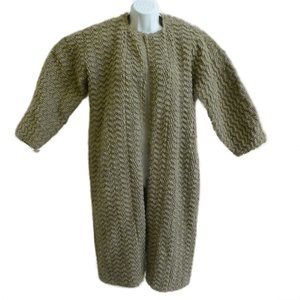 Vintage Boho Beige Boucle Woven Wool Duster Coat Jacket. Pockets. Micro Chevron Pattern. Open Front. Geometric Silver Ivory Gray Triangles Silky Lining. Embellished Ornate Trim. Guessing a hand woven wool blend with a raw silk/viscose blend. Tagged Size 6.
