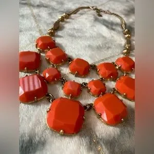 Beautiful tiered Stella & Dot necklace with coral hued epoxy stones, hand cast gold faceted beads with gold plating. Measures 16.5” with a 2” extender and a lobster clasp closure.