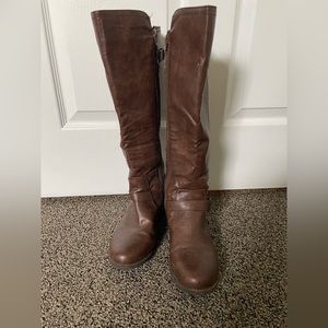 Brown riding boots, comfortable and cute for fall. The sit right below the knee and have elastic on the calf for a comfortable fit. Only wore these a handful of times and love them but they don’t get the wear they deserve.