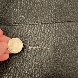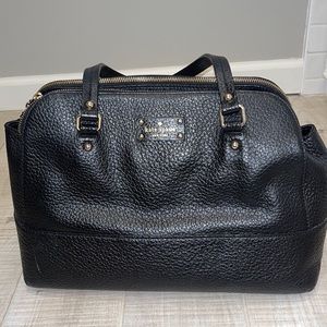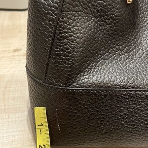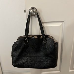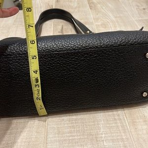 Beautiful, black pebbled leather purse. The inside has some old stains and the exterior has some scratches and scuffs. Please review all photos. It is in decent used condition with a lot of miles left, considering the sturdy hardware and great craftsmanship. The handle drop is 8 inches and the bag is approximately 10” high by 16”wide by 5” deep.
