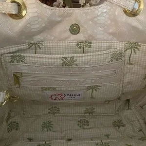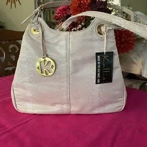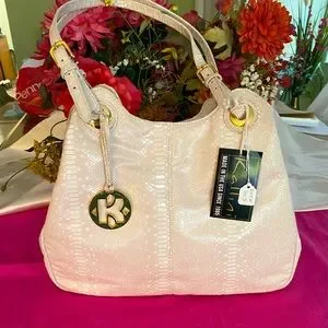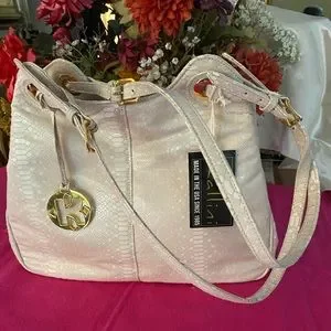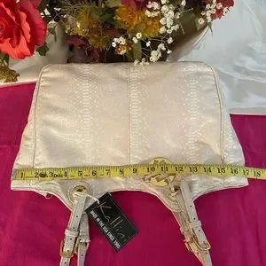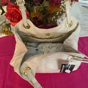 Convertible and adjustable straps tote, sneak print over ultra suede material very roomy multiple pockets beautiful cream and white color gold hardware adjustable shoulder straps . Never used very light weight, from smoking free home.
