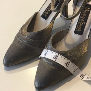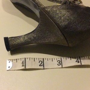 Dressy, Shimmery Material, Cute Ankle Strap, Classy and Sassy...Great for Holidays or Special Date! These are approx. 3.5” or bit less heels, width across front 5.5-6” and 5.5” approx 1” lower toward front. Approx 3” from middle front down to point and sole. Ankle strap 7.5” length (6.5” to last hole) has 1” elasticity for some extra give total ankle 11.5”. Ask questions pls.