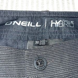 NWT (New With Tags) O’Neill hybrid shorts in dark grey with very subtle black horizontal pinstripes (tag reads "Black"). Men’s 30 inch waist, 21 inch length, 10.5 inch inseam. 92% polyester, 8% spandex. These shorts are very light, four-way stretchy, and comfortable. Please see photos for full details and comment with any questions. Thanks for looking and please tell your friends. All love, love all!