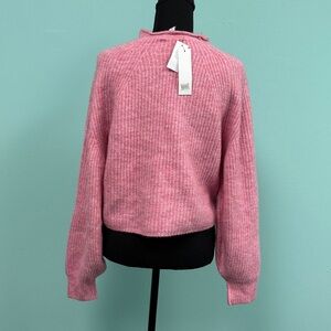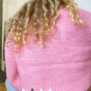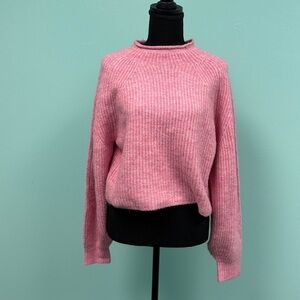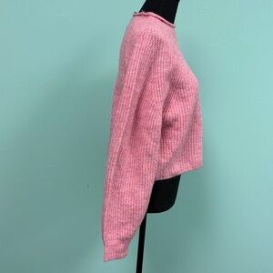 Topshop roll neck cropped sweater in light pink size 8-10. Rolled crew neck Raglan sleeves Hole-stitch detailing Cropped length Relaxed fit Slouchy cut 65% acrylic 28% polyester 4% elastane