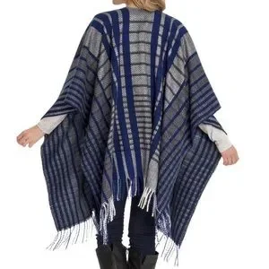 NWT Woolrich Blue/ GrayPlaid Blanket Wrap Scarf Poncho with Fringe