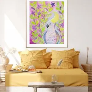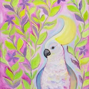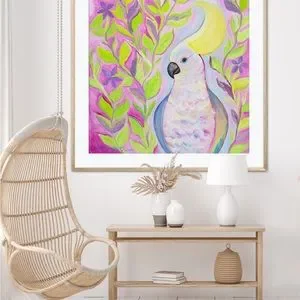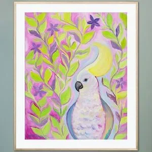 Cockatoo Hairdo Art Print Oil Painting tropical bird plants flowers whimsical
