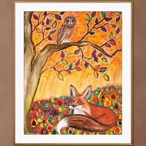 Fox Owl Autumn Ambience Art Print Oil Painting fall leaves tree animal whimsical
