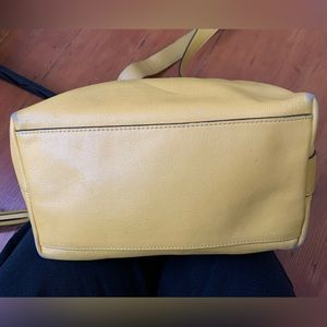 Bright yellow shoulder bag from Coach is an instant wardrobe pick-me-up. Adjustable shoulder strap allows it to be worn crossbody easily. Clean interior with no stains. Minor scuffing and rubbing externally. All zippers function well. 18” drop on lowest strap setting. Bag measures 13” x 11 1/2”.