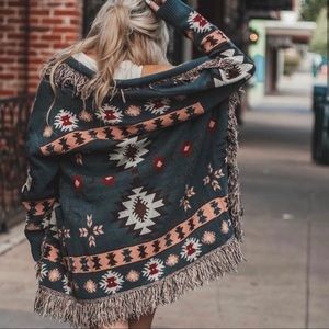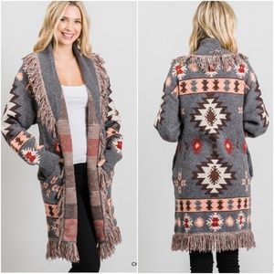 #18 Cozy Tribal Aztec Print Fringe Western Open Front Cardigan