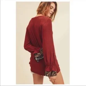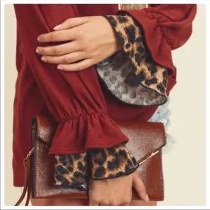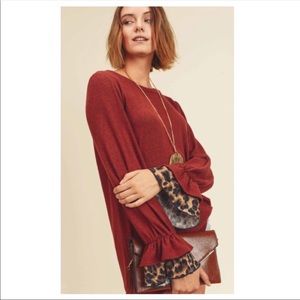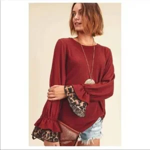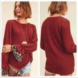 This top is beautiful and oh so Soft!!! Gorgeous Cashmere with a slight ruffle flare cuff and a contrasting Leopard print layer underneath.