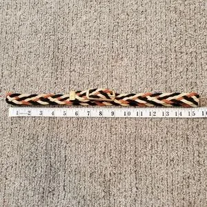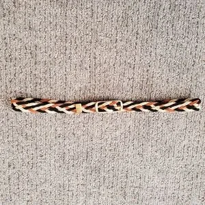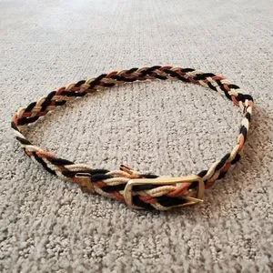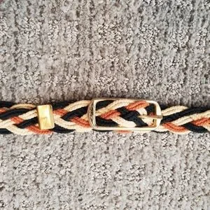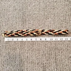 Vintage braided belt in black, brown and off white. Adjustable size. Gold tone buckle. See photos for measurements and small dark spot.
