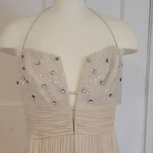 Cream color, Vintage style halter gown. Has a deep V and beads embellished bust. Size 6. Brand new and still in bag.