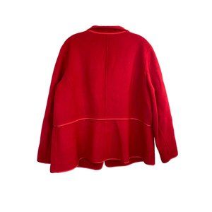 boxy jacket, oversized jacket, holidays, festive, preppy, bright, Talbots outerwear, Talbots blazer, Talbots wool jacket, wool suit jacket, fall coat, autumn coat, vintage blazer, wool blazer, vibrant, professional, office, business casual, tailored, stand collar wool blazer, corporate, career, equestrian, riding, winter red wool coat, satin trim, ribbon trim, silk trim