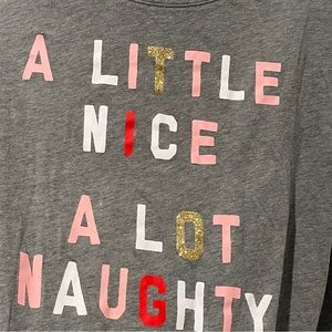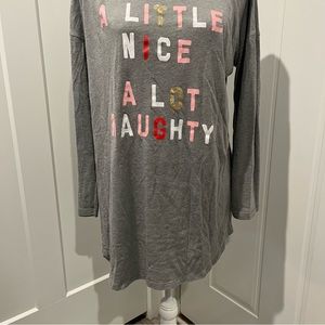 Victoria Secret Nightshirt Sz M in good used condition is grey with “A little Nice A Lot Naughty” on front 2 letters are gold glitter! So cute! Has long sleeves, round neckline. Measures approximately 23” pit to pit and approximately 32” in length Comes from a pet & smoke free home