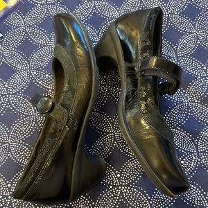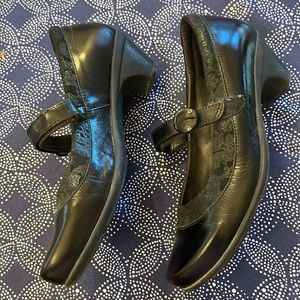 Naot Mary Janes - Black with floral detail. Lightly worn. Small scuff on heel and slight scratch on the bottom of the heel. Comfortable and professional.