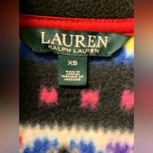 This RL Aztec print full zip fleece jacket is in excellent condition! It’s a women's size XS. Colorful Southwestern design (not lined) with side pockets and a double zipper. 100% polyester fleece.