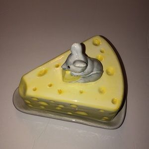 Covered cheese dish is a large wedge of yellow cheese with an adorable little mouse siting on top as the handle