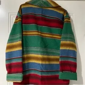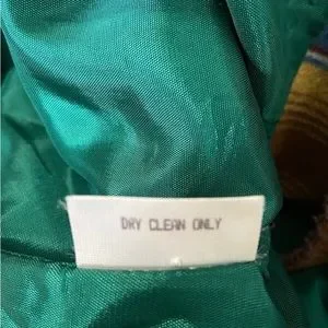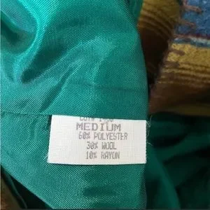 Ladies Size M Breeches Colorful Lined Jacket, 2 Button Closure, 2 Front Pockets 60% Polyester 30% Wool 10% Rayon, 28.5" From Back at Neck to Bottom of Jacket. Good Condition Preowned, Stained Area on Cuff (when rolled up) as shown in picture, would probably come out when cleaned.