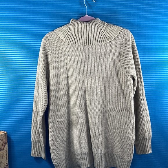 Tan or light brown cowl neck pullover sweater with copper colored threading throughout. The pics don’t show the copper threading but it has a very light shine to it. It really sets off the sweater. I have it paired up with burnt orange accessories. Size XL