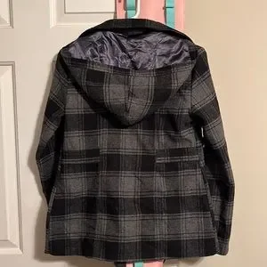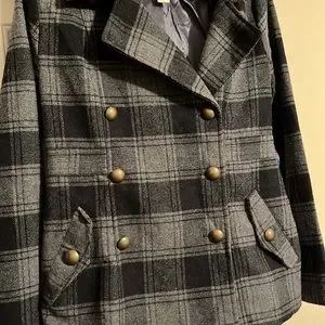 Black and gray, hooded with pockets. Nice brassy look rounded buttons.