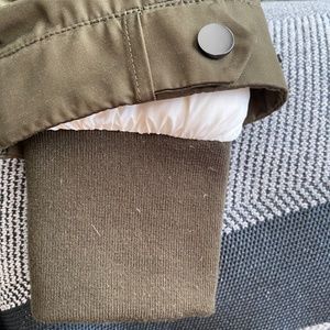 This is the most fabulous warmest coat you can own! Nearly new olive green 3/4 length parka with fur lined hood. Water resistant, removable down lining, can tie to cinch at waist. Inner cuff assures that wind, rain or snow can’t go up your arm. Neutral olive green goes with everything.