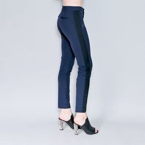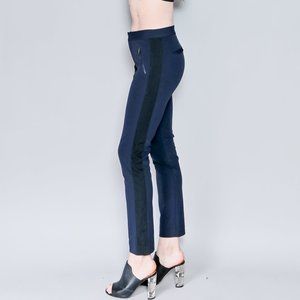 Rebecca Taylor dark blue Ava Techie skinny pants with black tuxedo stripe. Zipper fly, decorative pocket zippers (not real pockets), Size 4.