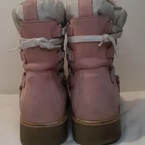 Suede Leather and Manmade Material Upper. Fur Lining. Rubber Sole. 8" height. 1.25" heel. 6" opening. Size 10. Stay Warm and Comfortable in these Lace up Booties. Timberland Quality. Pre-owned. Great Condition. Some Scuffing. Sole looks Brand New. See photos for details. Let us know if you have questions. Ship fast. WE LOVE OFFERS. Great Addition to your Fall Shoe Selection.
