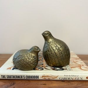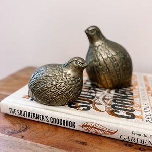 neutral boho natural retro shiny indie unique kitchen counter bookshelf shelf book ends moody maximalist chickens paper weight outdoors woodsy woodland partridge in a pear tree quail hunt gather thanksgiving tablescape christmas holiday shelfie partridge quail poultry homestead gilded earthy decor