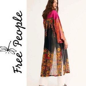A long, flowy Free People kimono cardigan that emits retro vibes! This piece features a floral pattern and is made with polyester and rayon for a lightweight feeling. Originally $228; tag removed.