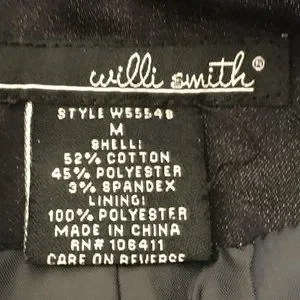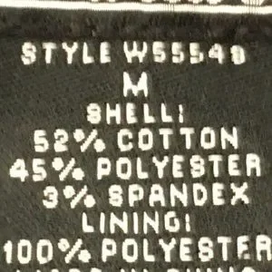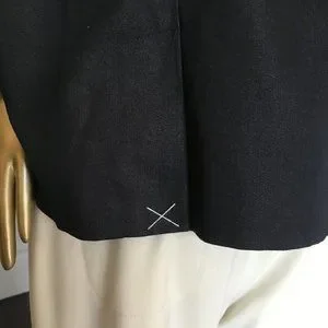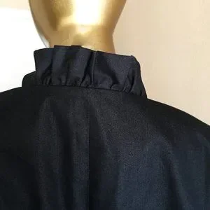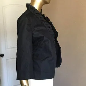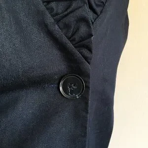 Single button jacket with a sweet 1.75" ruffle along lapel and around collar to stand up in back. This jacket has NEVER BEEN WORN, the 5" back vent is still stitched shut! Fully lined with 3/4 Sleeves. Cotton blend with 3% Spandex! Slight pad in shoulder