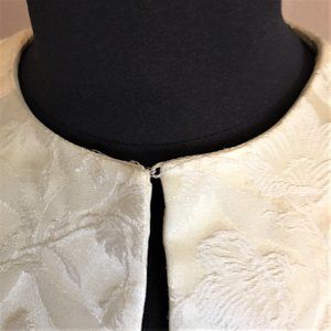 Darts at elbows, bust and back of shoulder for super-feminine fit. Fully lined in creamy, silky light yellow fabric. Hook/eye closure at throat