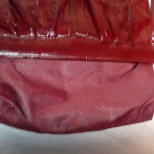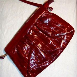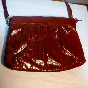 Burgundy/wine-colored eel skin purse with gold-tone hardware and one interior zip pocket. Full zipper closure. Shoulder strap is approximately 25" long and is not removable. 11 x 7.5 x 1". Gently used. Lining shows some use. Non-smoking, pet-free location.