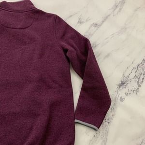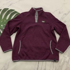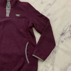 LL Bean women's dark purple and gray snap trim fleece pullover sweater, size M. It is free from any rips or stains. It measures about 44 inches around the bust and is about 26 inches long.