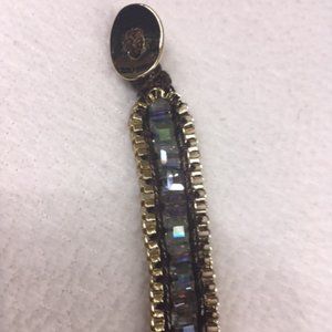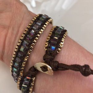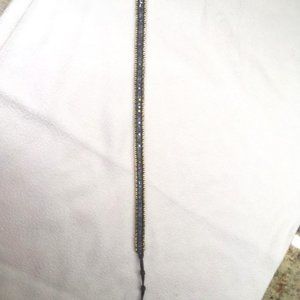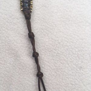 This versatile piece can be worn as a wrap bracelet or as a choker necklace. Colorful crystals show off beautiful blues, pinks, greens, and purples that are weaved into the center of this piece, which are flanked by interlocking metal pieces on both sides of the crystals. It's a bold piece that is also soft and feminine. There are three button 'holes' on the knotted, corded/braided end of this piece, so it's adjustable to accommodate various neck/wrist sizes, and there's an oval metal button weaved onto the other end. The button fits snugly in the button holes and do not come loose. Purchased from Sundance Catalog.